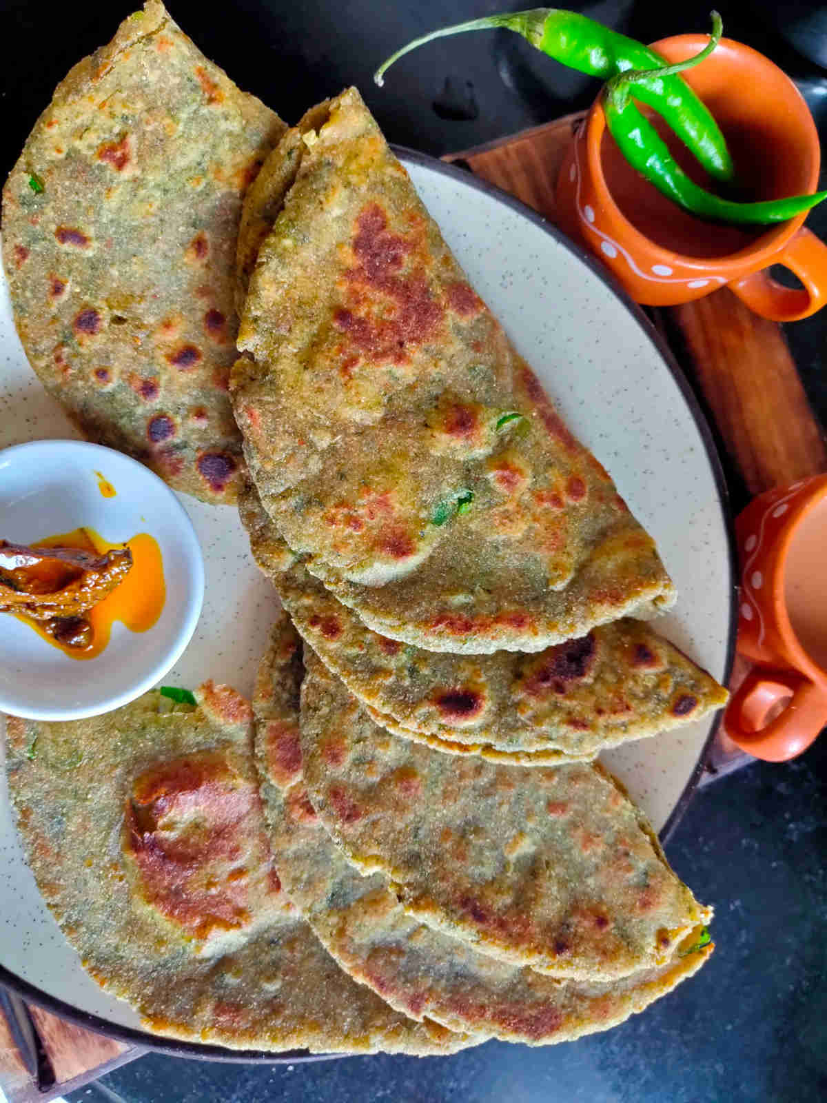 Bathua Paratha is a nutritious Indian flatbread made with fresh bathua leaves and whole wheat flour. It is rich in iron, fiber, and antioxidants, making it a healthy and comforting meal for any time of the day.