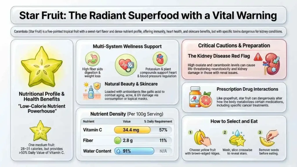 The primary benefit of star fruit is its ability to support immune function, digestive health, and blood sugar management through its rich supply of Vitamin C, dietary fiber, and antioxidants. This low-calorie, low-sugar tropical fruit is an excellent choice for individuals with healthy kidney function seeking a refreshing, nutrient-dense snack that fits easily into a busy Indian lifestyle.