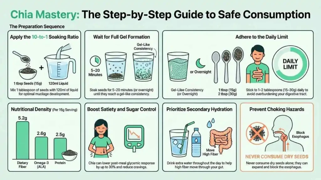 3. Water is Non-Negotiable: Because chia pulls water into the gut, you must increase your daily water intake by at least two glasses to prevent constipation.
