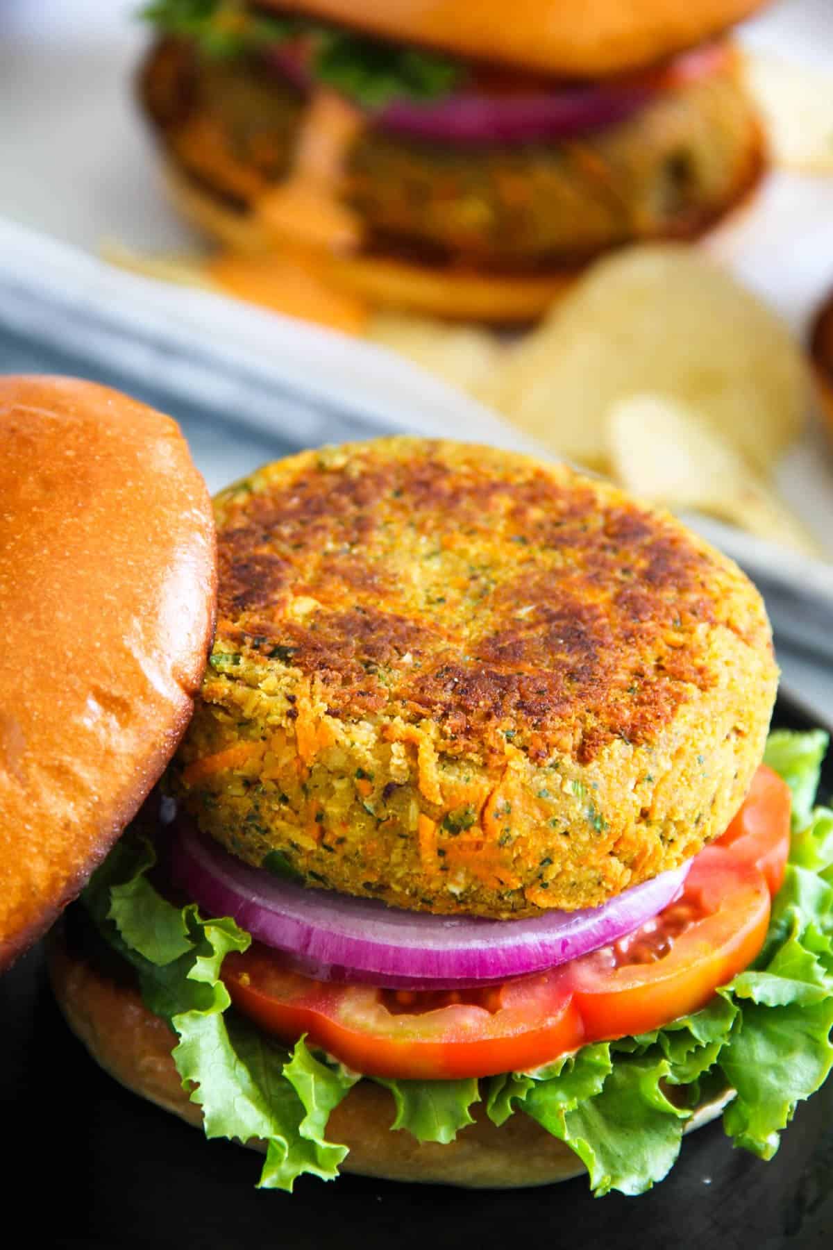 - Toast burger buns lightly (optional). Place lettuce on bottom bun, then the chickpea patty, tomato slice, onion and cucumber (if using). Cover with top bun.