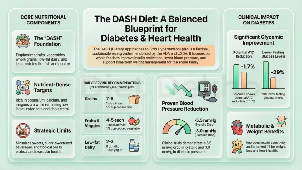 The Dietary Approaches to Stop Hypertension (DASH) eating plan was originally developed by the National Institutes of Health (NIH) to combat high blood pressure. However, over three decades of research have revealed that its benefits extend far beyond the arterial walls. For the diabetic patient, the DASH diet serves as a multi-target metabolic regulator that optimizes glucose homeostasis, reduces oxidative stress, and inhibits systemic inflammation.