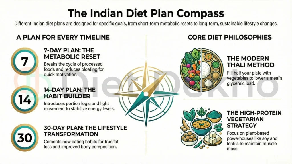 An Indian diet plan for weight loss celebrates our traditional food wisdom while adjusting for modern, sedentary lifestyles. This plan is for the “thali lover” who wants to enjoy dal, sabzi, and roti without the guilt. According to data from the NCBI, abdominal obesity is a rising concern in India, affecting 40% of women. The logic centers on the Plate Method, where half the plate is filled with non-starchy vegetables to lower the overall glycemic load of the meal.