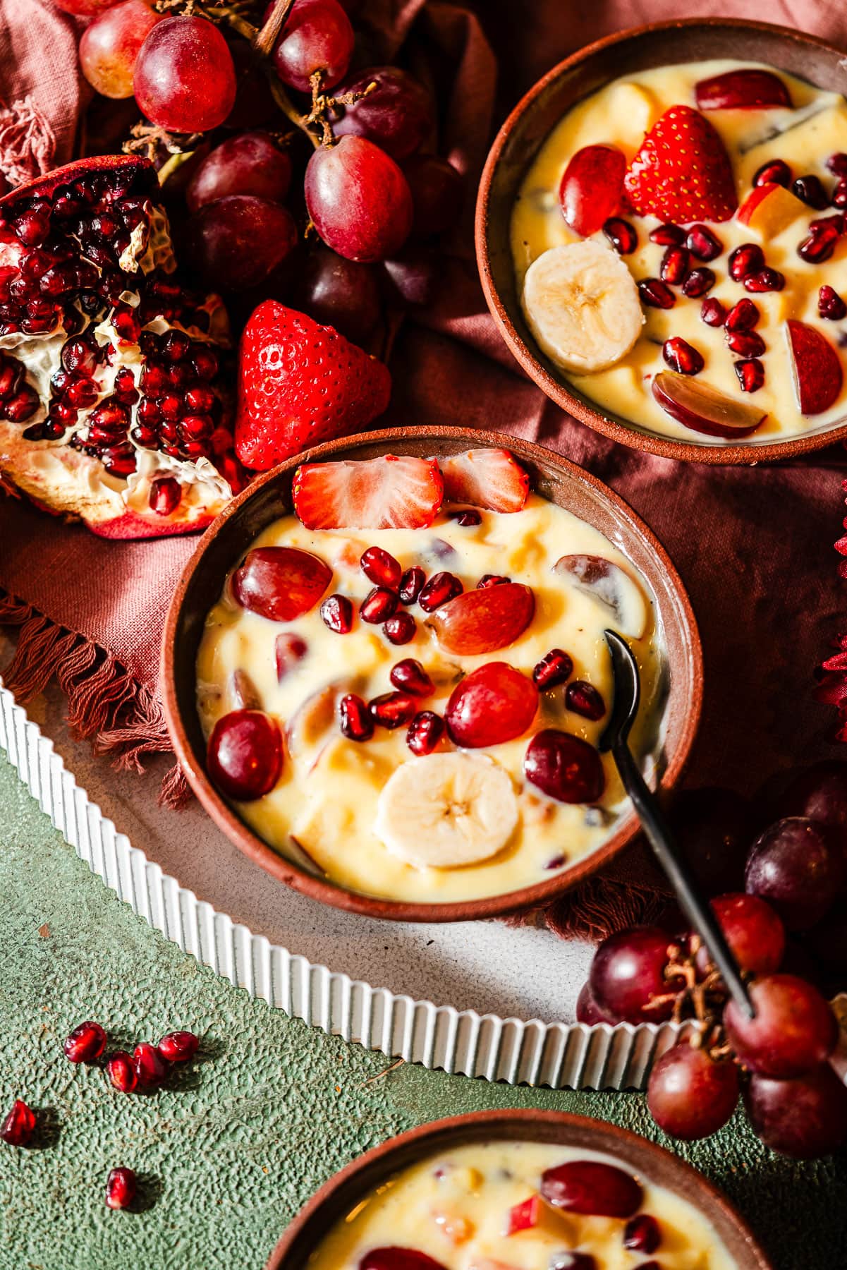 Use only fresh and firm fruits. Avoid citrus fruits like oranges inside the custard to prevent curdling. Add bananas only before serving to avoid browning.