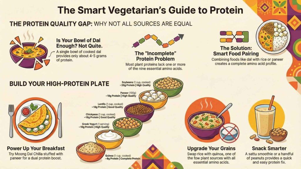 Many people believe that vegetarians cannot get high-quality protein because plant sources are “incomplete.” This is a myth that needs to be buried. The secret lies in a concept called amino acid complementarity. Grains like rice are low in an amino acid called lysine but high in methionine. Legumes like rajma or dals are the exact opposite.
