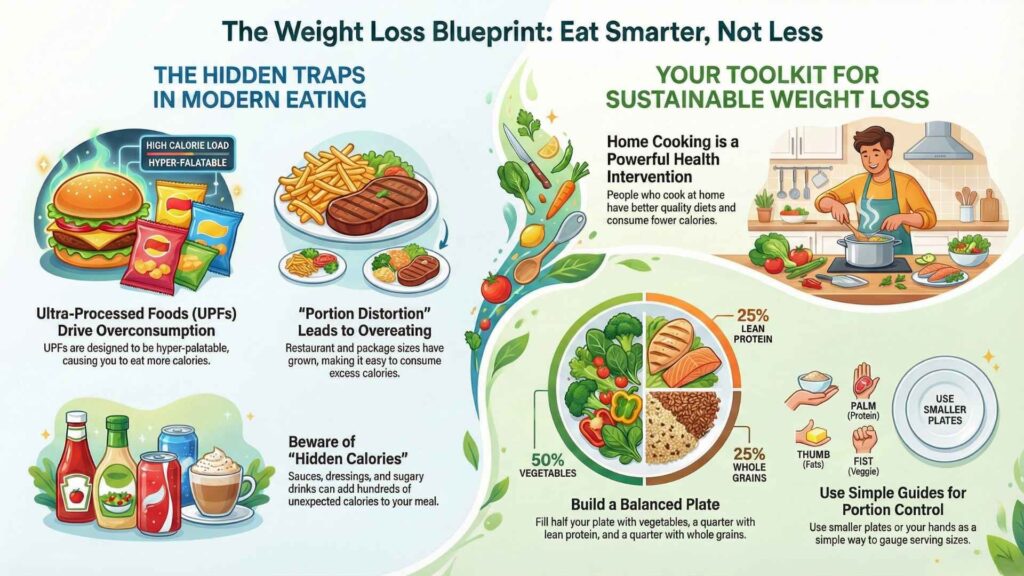 The struggle to manage weight often feels like an uphill battle against an environment designed to make us overeat. Restaurant portions have ballooned over the last twenty years. A standard bagel used to be three inches wide; now it is six. Burgers have nearly doubled in size. When you eat out, you consume what is put in front of you. Research from Cornell University shows that adults eat 92% of whatever is on their plate. This is why the home environment is your greatest asset. At home, you decide the portion. You choose the oil. You control the salt.