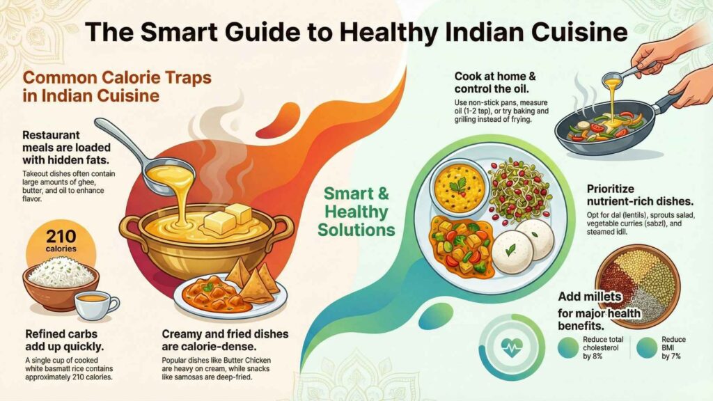 Dals are the primary source of plant-based protein in India, but their caloric value can be doubled by a heavy “tarka” or tempering of ghee and oil. Research shows that traditional dal tempered with ghee contains about 254 calories per cup, while a dal made with dry-roasted cumin seeds contains only 213 calories. What this really means is that by simply changing your tempering technique, you can save 40 calories per meal without sacrificing the nutritional core of the dish.