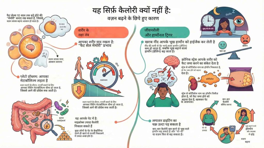 मोटापा तब बढ़ता है जब शरीर में इंसुलिन और लेप्टिन जैसे हार्मोन का संतुलन बिगड़ जाता है। विज्ञान के अनुसार, यह केवल ज्यादा खाने का मामला नहीं है। वास्तव में, भारतीय आहार में 62% कार्बोहाइड्रेट की अधिकता और मांसपेशियों की कमी मेटाबॉलिज्म को धीमा कर देती है। नतीजतन, शरीर कैलोरी जलाने के बजाय उसे फैट के रूप में स्टोर करने लगता है 1।