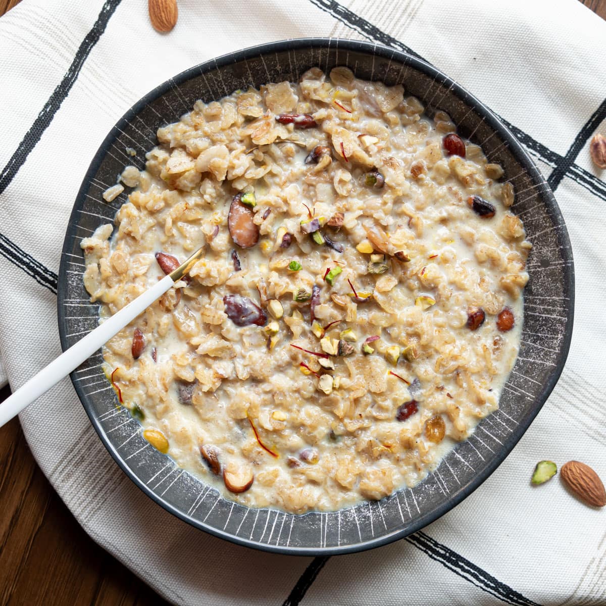 A light and creamy Indian Oats Kheer made with rolled oats, milk and cardamom. A healthy dessert ready in minutes.