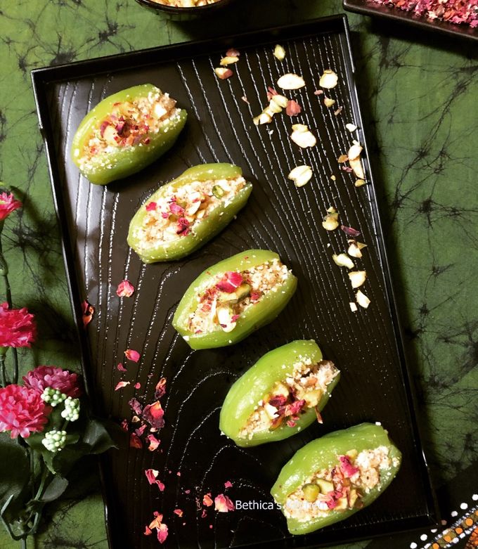 - Remove the parwals from syrup and place them on a plate, tilting slightly so excess syrup drains off. Stuff each parwal gently with the khoya-nut mixture and press lightly so filling stays inside. Garnish with a few pistachio slivers on top.