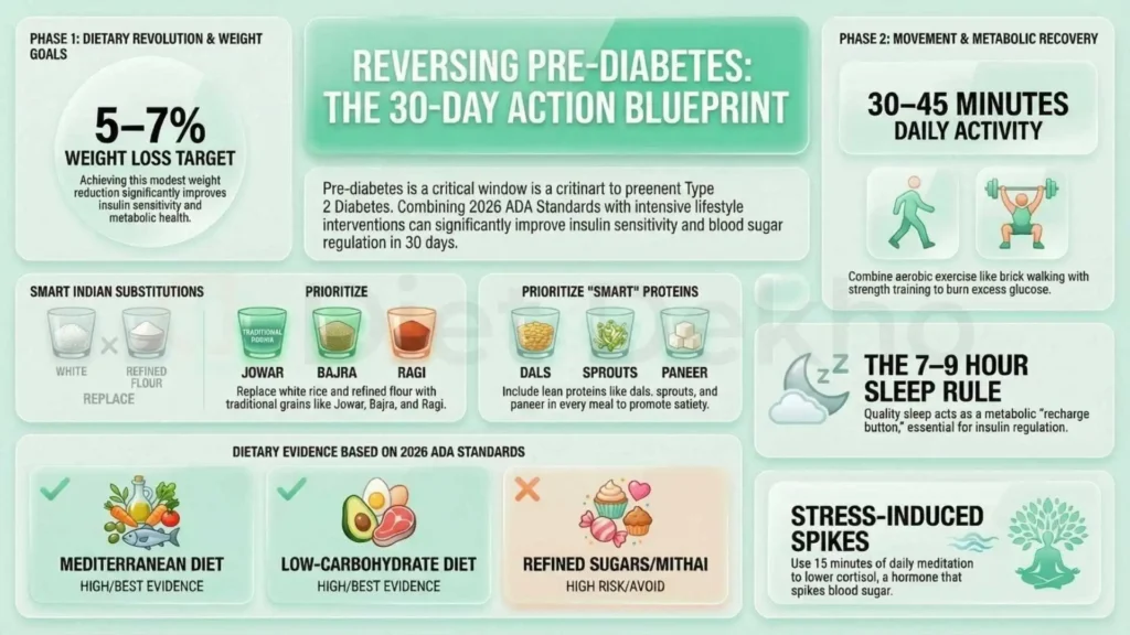 To reverse prediabetes, you must follow a pre diabetic diet chart that prioritizes low-glycemic index (GI) foods, high fiber (25–40g daily), and lean protein. Focus on replacing white rice with millets, finishing dinner three hours before sleep, and completing 150 minutes of weekly activity. These steps improve insulin sensitivity and help normalize blood sugar naturally.