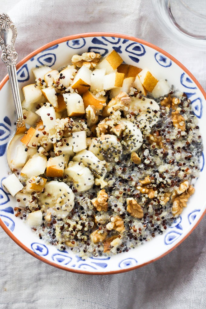 A simple, nutritious quinoa porridge with milk, nuts and dried fruit — a wholesome vegetarian breakfast that’s gluten-free and easy to make at home.