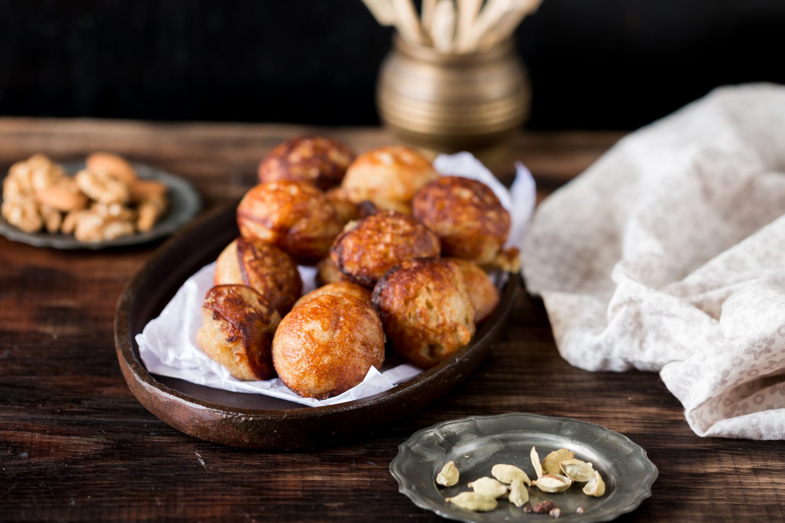 A healthy Indian-style sweet paniyaram made with quinoa and rice, lightly sweetened with jaggery and flavoured with cardamom — perfect for breakfast or teatime snack.