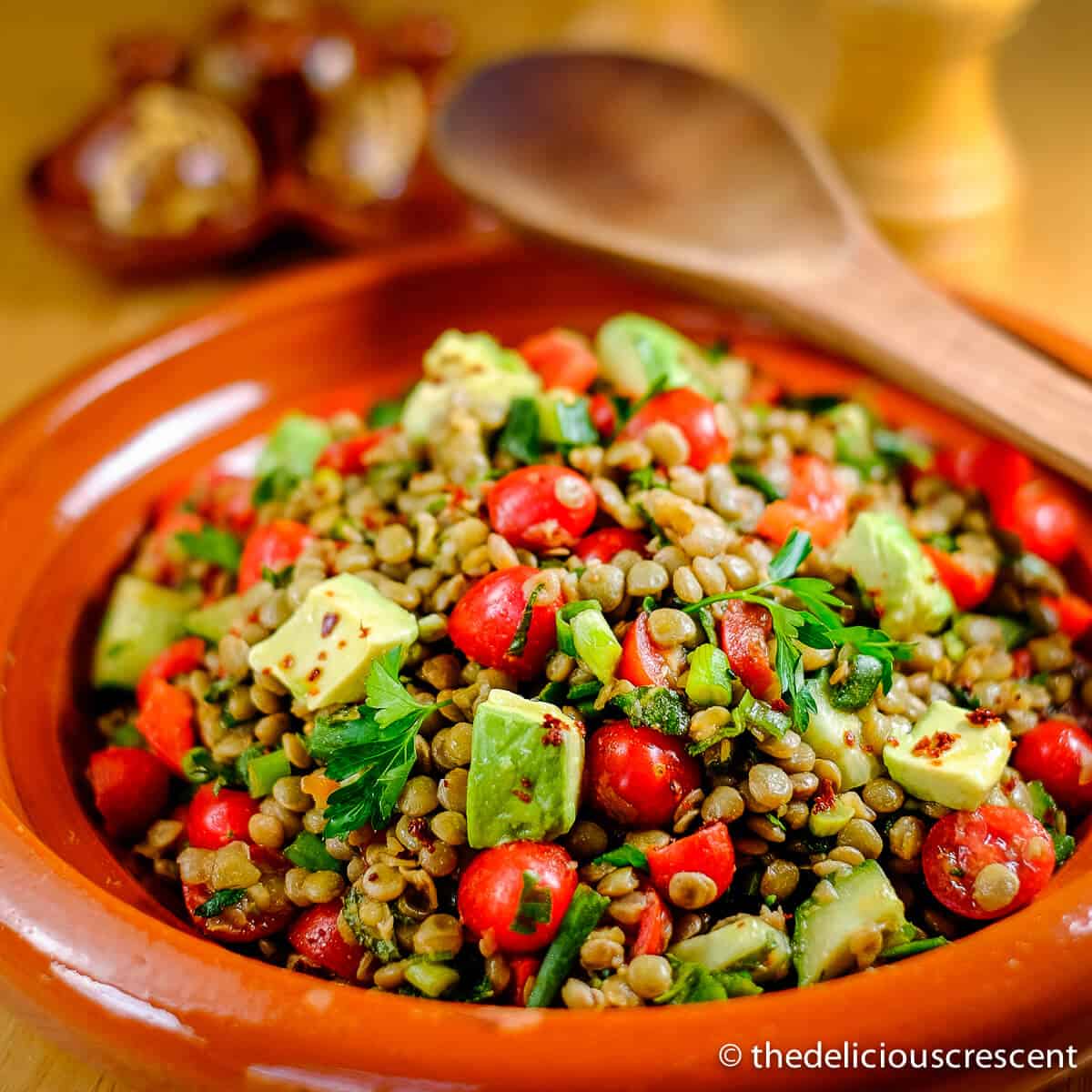 - In a large bowl, combine cooled lentils, chopped vegetables and herbs. Pour the dressing over and toss gently to mix.