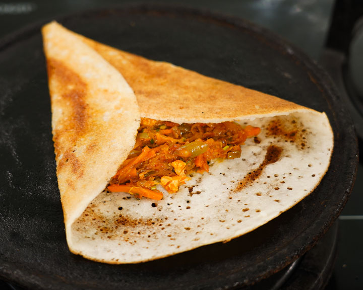 9. Spread 2–3 tbsp of prepared vegetable masala on one half of the dosa. Fold the dosa over the filling. Press gently and cook for another 30 seconds.