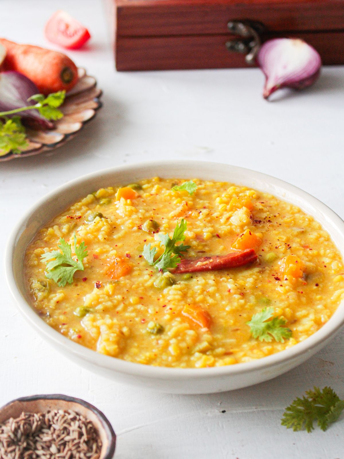 A wholesome Indian one-pot meal of rice, moong dal and seasonal vegetables — healthy, easy to cook and gentle on digestion.